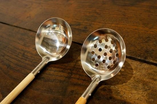 ステンレスの一大産地、新潟県燕市で伝統工芸を活かしながら製品を生み出す「工房アイザワ」の、少し小さめのおたまと穴明きおたまです。