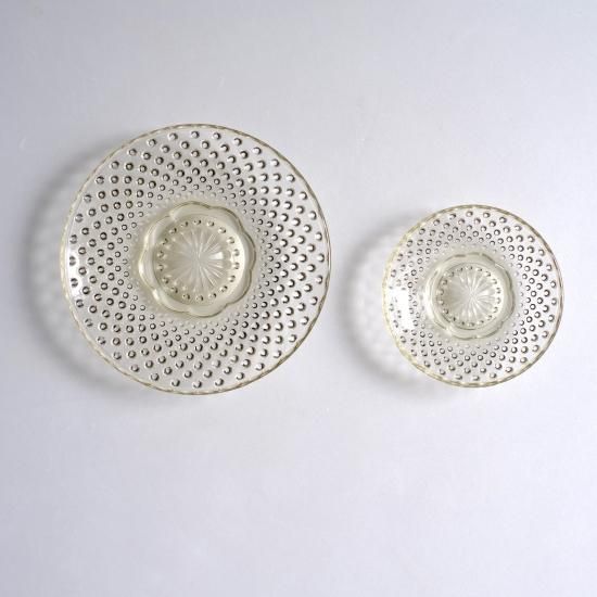 廣田硝子の「あられシリーズ」はその硝子を現代の生活に合わせて、再度つくられた日本製プレスガラスです。きらめくつぶつぶの真ん中には、梅の花を思わせるデザインがあり、和を感じられるこだわりが見られる豆皿と小皿です。